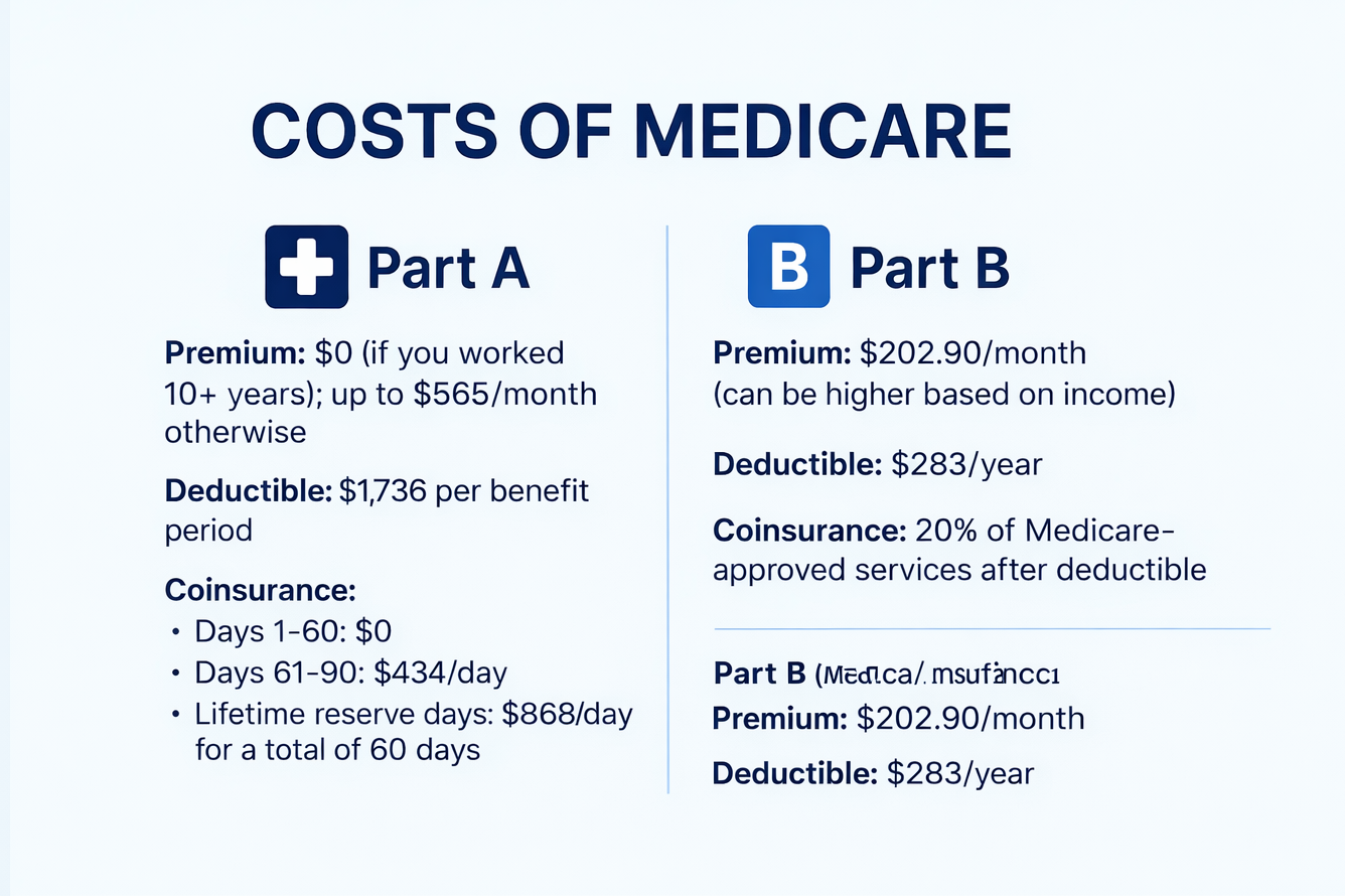 Part B requires a monthly premium and includes an annual deductible and 20% coinsurance on most services.